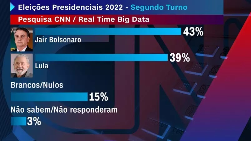 O presidente Jair Bolsonaro (sem partido) aparece na liderança das intenções de voto em pesquisa realizada pela parceria CNN/Instituto Real Time Big Data sobre as eleições presidenciais de 2022.