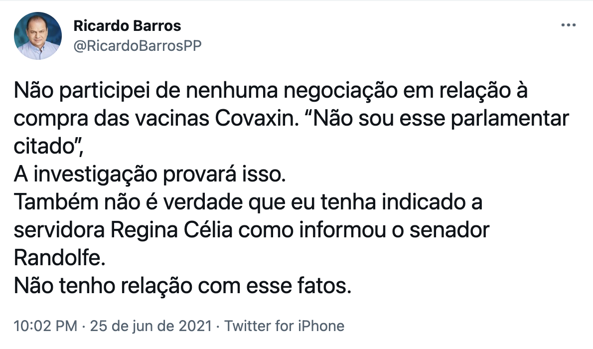 O líder do Governo na Câmara, respondeu em seu Twitter que não participou de nenhuma negociação em relação à compra das vacinas indianas. Em outra publicação, disse que está a disposição para esclarecimentos.