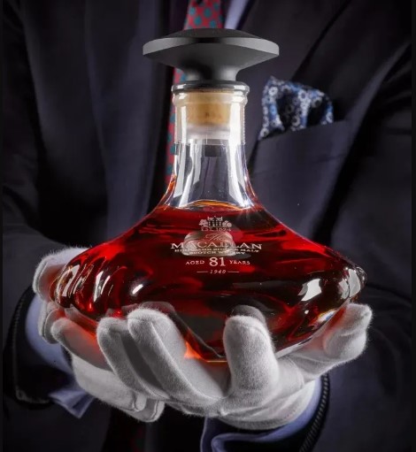 O uísque é da marca Macallan e foi destilado na década de 1940. No conjunto, há uma garrafa de 700 ml exclusiva com a bebida, uma escultura de bronze, representando três mãos, e um gabinete feito com madeira de olmo.